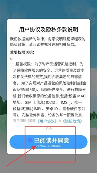 1. 打开【轻记课程表】后,点击“已阅读并同意”按钮,确认协议后即可进入应用主界面。