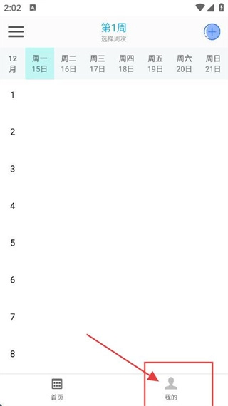 2. 当处于展示第1周日程的课程表主界面时,点击底部的【我的】按钮,即可进入个人中心页面。