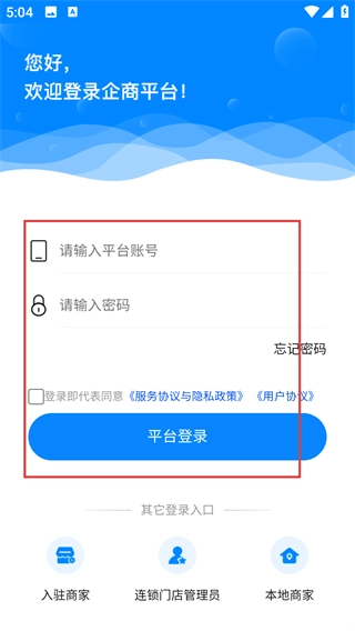 1、在企商平台的登录界面,依次填写【请输入平台账号】和【请输入密码】两个输入框,随后点击【平台登录】按钮,就能完成平台账号的登录流程。