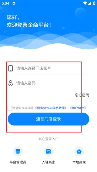 2、切换到连锁门店登录界面,在【请输入连锁门店账号】栏填写账号并输入密码,点击【连锁门店登录】按钮,即可完成该账号的登录操作。