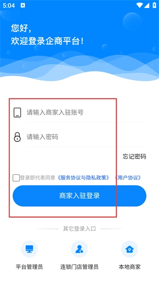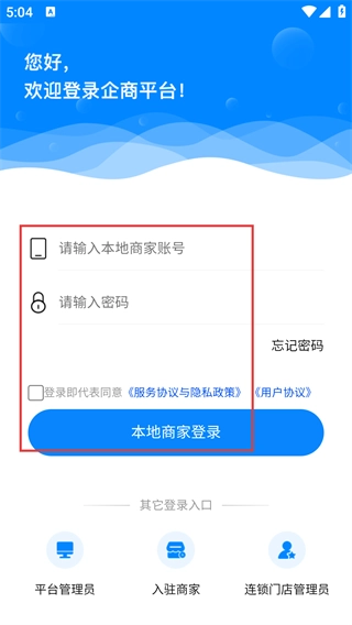 4、切换至本地商家登录界面,在【请输入本地商家账号】栏和密码栏填写对应信息,点击【本地商家登录】按钮,即可完成本地商家账号的登录操作。