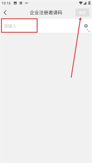 2、在【企业注册邀请码】页面的输入框中填写邀请码,填写完成后点击右上角的【确定】按钮,就能提交邀请码信息。