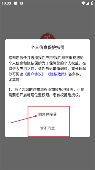 1、进入应用前,请先查阅【用户协议】和【隐私政策】,在了解个人信息保护相关条款后,点击【同意并接受】即可进入应用主界面。
