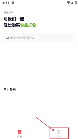 在【奇乐】主界面,你可以通过底部的【我的】入口进入个人功能模块,还能利用搜索栏查找各类食品好物。