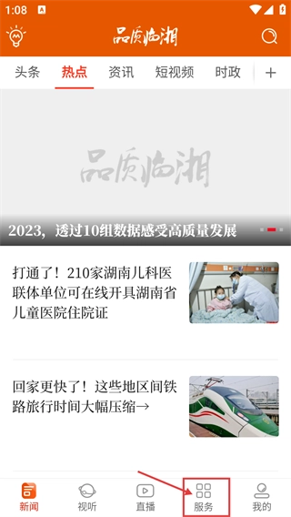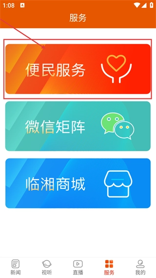 1、在“品质临湘”新闻页面,点击底部的【服务】入口,就能进入服务功能页面,获取便民、商城等各类服务选项。