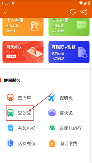 3、在便民服务板块里找到【查公交】选项并点击,就能进入公交查询页面,查看实时的公交路线动态信息。