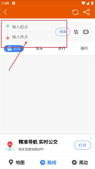 4、进入公交查询页面后,填写【起点】和【终点】的相关信息,点击【搜索】按钮,就能得到对应的公交出行路线。