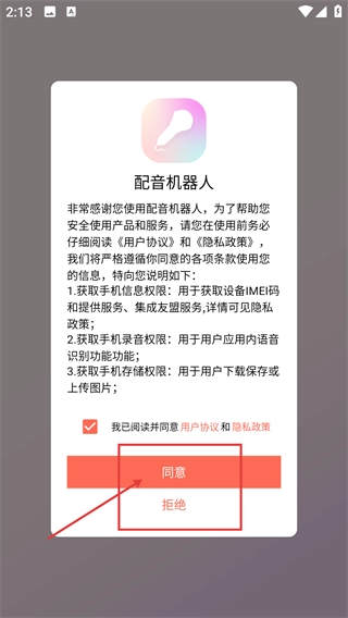 在使用【配音机器人】前,您需要仔细阅读并审阅【用户协议】与【隐私政策】,在勾选同意相关条款后,点击【同意】按钮,就能进入应用的引导界面。