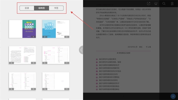 4、在阅读界面中,借助【目录】【缩略图】【书签】这些功能,能够快速定位书籍内容、把控阅读进度。