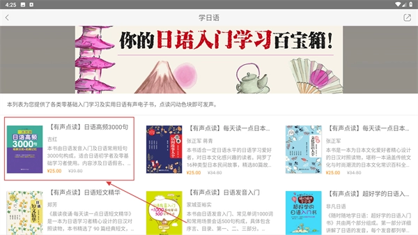 1、在首页找到并点击【学日语】功能入口,进入日语学习资源列表页面后,即可浏览各类相关有声书籍。