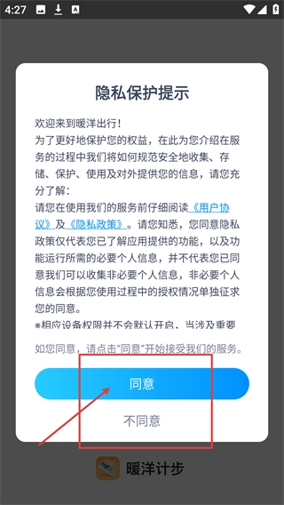 1、打开应用后会弹出【隐私保护提示】,点击【同意】按钮即可进入应用,同时启用出行与健康相关功能。
