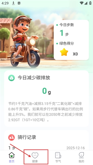 2、在首页能看到【今日步数】-【今日减少碳排放】等信息,点击底部导航栏的【健康】按钮,即可进入健康功能页面。