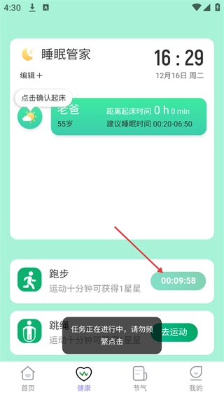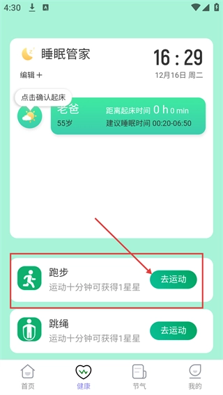 3、健康页面设有【睡眠管家】模块,其下方排列着【跑步】-【跳绳】等运动选项,点击跑步选项旁的【去运动】按钮,即可开启该运动的计时任务。