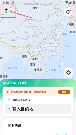 1、在【无人车·打萝卜】界面,点击左上角人像。