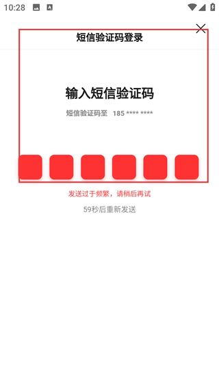 3、选择【短信验证码登录】的方式,在对应的输入框中填写收到的验证码,要是遇到发送频繁的提示,需要等待之后再进行重试。