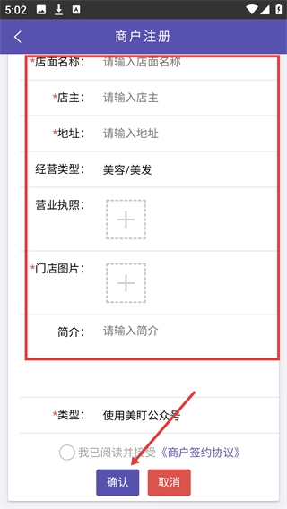 2、商户注册时,需在注册页面填写店面名称、店主、地址等必填信息,上传营业执照和门店图片,然后勾选相关协议并点击【确认】按钮,即可完成注册流程。
