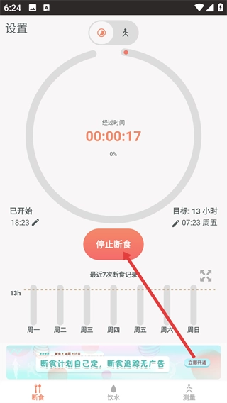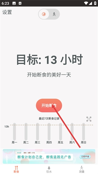 1、进入断食功能界面后,点击【开始断食】按钮,即可启动时长为13小时的断食计时流程,此时界面会显示计时进度。