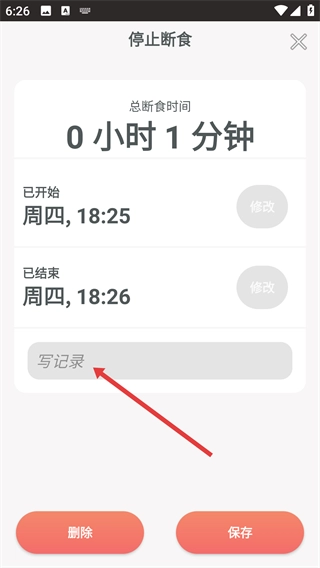 3、在断食停止的编辑界面里,点击【写记录】输入框,填写此次断食的相关备注内容(例如“饭后节食”)。