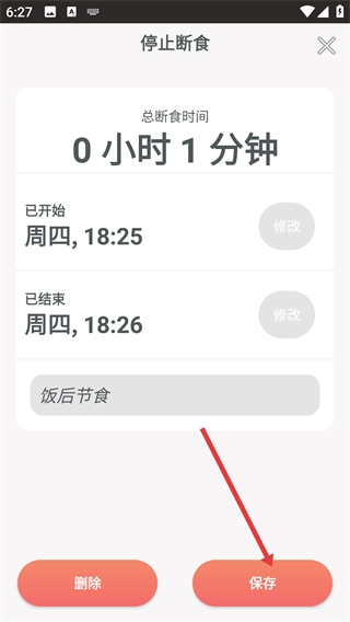 2、在断食进行时,点击【停止断食】按钮,即可结束当前的断食计时,并进入断食记录的编辑界面。