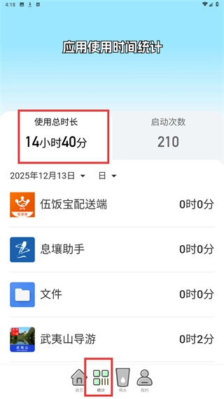 3、切换至应用统计页面,能够查看【使用总时长】【启动次数】等数据,从而了解各个应用的使用状况。