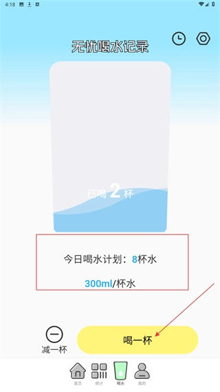 4、进入喝水记录页面后,点击【喝一杯】按钮,即可记录当天的饮水情况,帮助达成【今日喝水计划:8杯水】的目标。