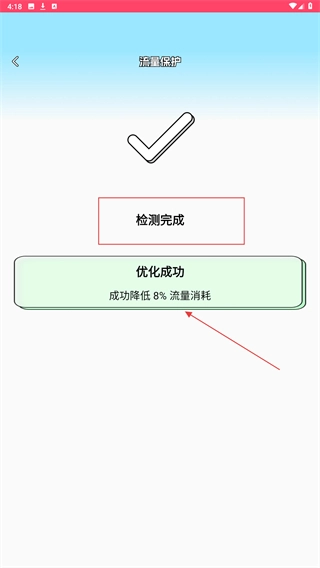 2、检测结束后,系统会显示【优化成功】的提示,这能减少8%的流量使用量,从而完成流量保护的优化步骤。