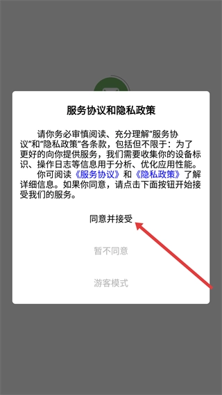 1、仔细阅读【服务协议和隐私政策】里的各项条款,在清楚了解信息收集规则后,点击【同意并接受】按钮,这样就能正常使用应用的所有服务功能了。