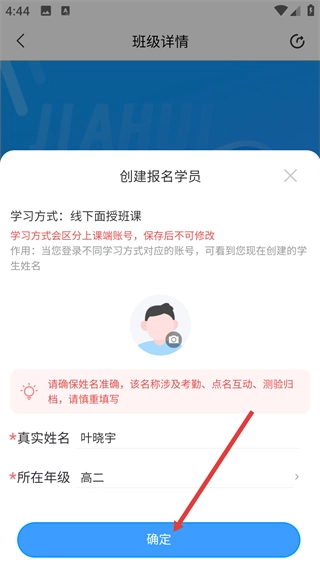 4、在【创建报名学员】弹窗里,填写【真实姓名】【所在年级】等相关信息,确认无误后点击【确定】按钮,即可完成报名信息的提交。