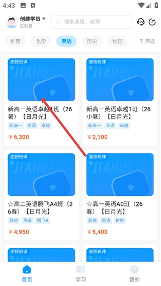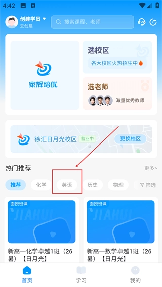 1、在【家辉培优】首页,选定当前校区后,点击【英语】分类标签,即可筛选出该学科的相关课程。