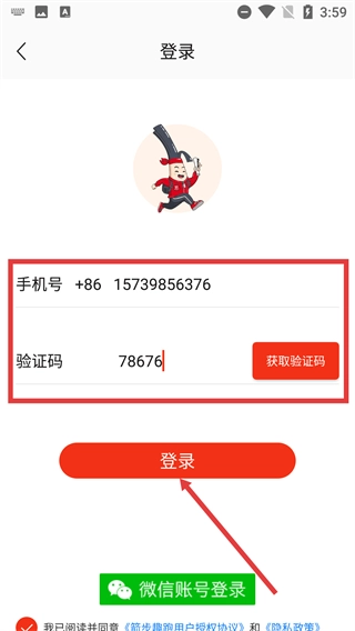 2、进入登录界面,填写账号并获取、输入验证码,勾选相关协议后,点击【登录】按钮完成账号登录操作。