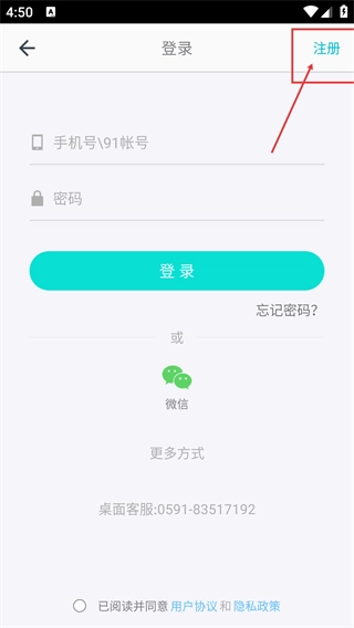 3、在【登录】界面里,点击右上角的【注册】选项,就能切换到账户注册的操作页面,从而完成新账户的创建。
