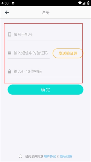4、进入【注册】界面后,需依次填写【号】、获取并输入【验证码】、设置【6-18位密码】,完成后点击【确定】即可提交注册信息。