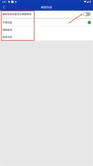 4、进入解锁伪装页面后,能够设置【解除伪装后是否仍需解锁】的开关,并且可以选择【不再伪装】【强制崩溃】等不同的伪装模式。