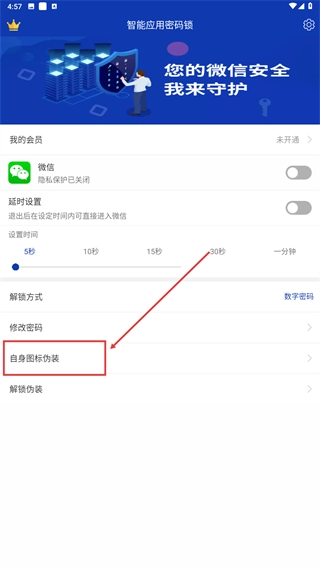 2、进入智能应用密码锁主界面后,找到【自身图标伪装】选项,点击进入图标伪装设置页面。