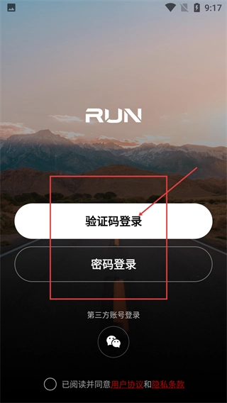 2、进入【RUN】的登录界面后,可选择【验证码登录】或【密码登录】等方式,登录前需要先勾选相关协议,再进行登录操作。