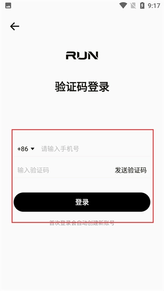 3、在【RUN】的【验证码登录】页面,选择【+86】区号,输入号码后点击【发送验证码】,填写验证码后点击【登录】即可完成操作。