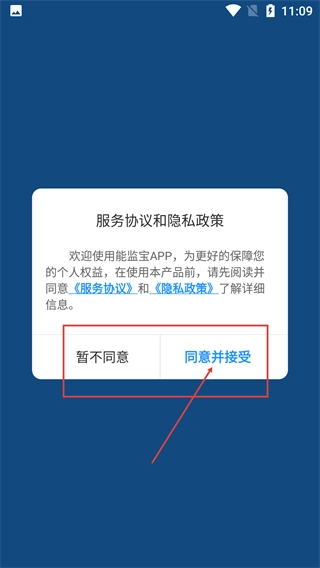 1、在使用能监宝之前,需要先阅读《服务协议》和《隐私政策》,然后点击弹窗里的“同意并接受”按钮,这样才能进入应用的后续界面。