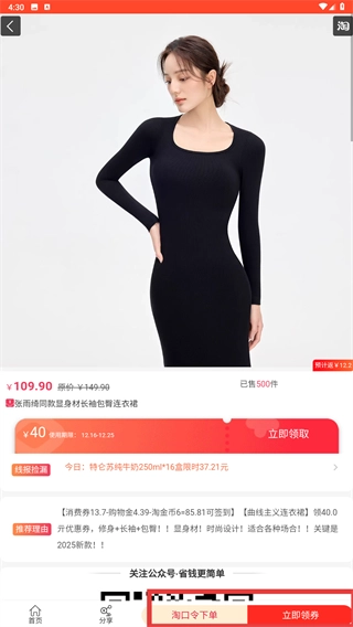 3、切换到【淘宝】页面,浏览券后商品列表,挑选目标商品(例如连衣裙),点击进入商品详情页。