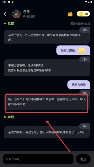 4、按照互动给出的提示,回复和情绪有关的内容,以此得到【乐乐】的反馈与引导,从而完成情绪记录的互动环节。
