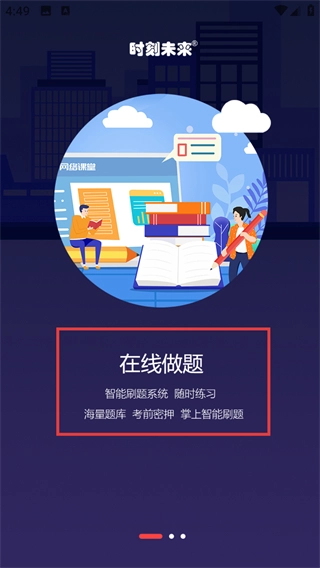1、进入【时刻未来】的【在线做题】模块,通过【智能刷题系统】使用【海量题库】里的考前密押资源进行随时练习,以此提升备考效率。