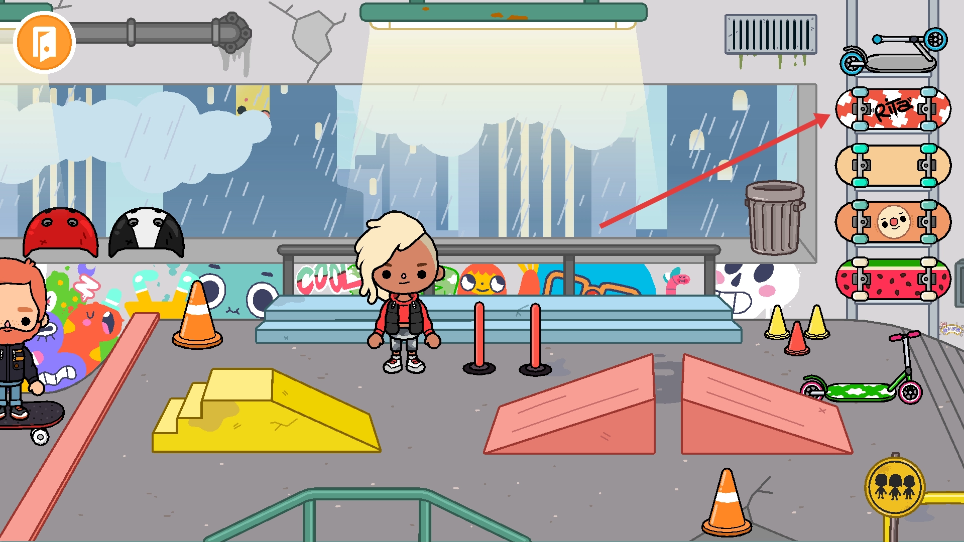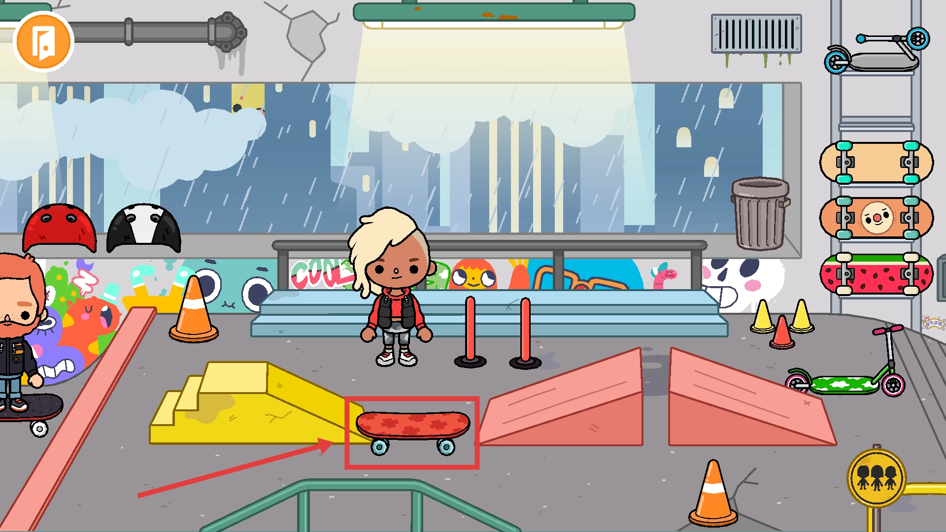 2、处于室内场景时,点击右侧的【滑板】道具并将其选中,以便为后续角色互动做好准备。