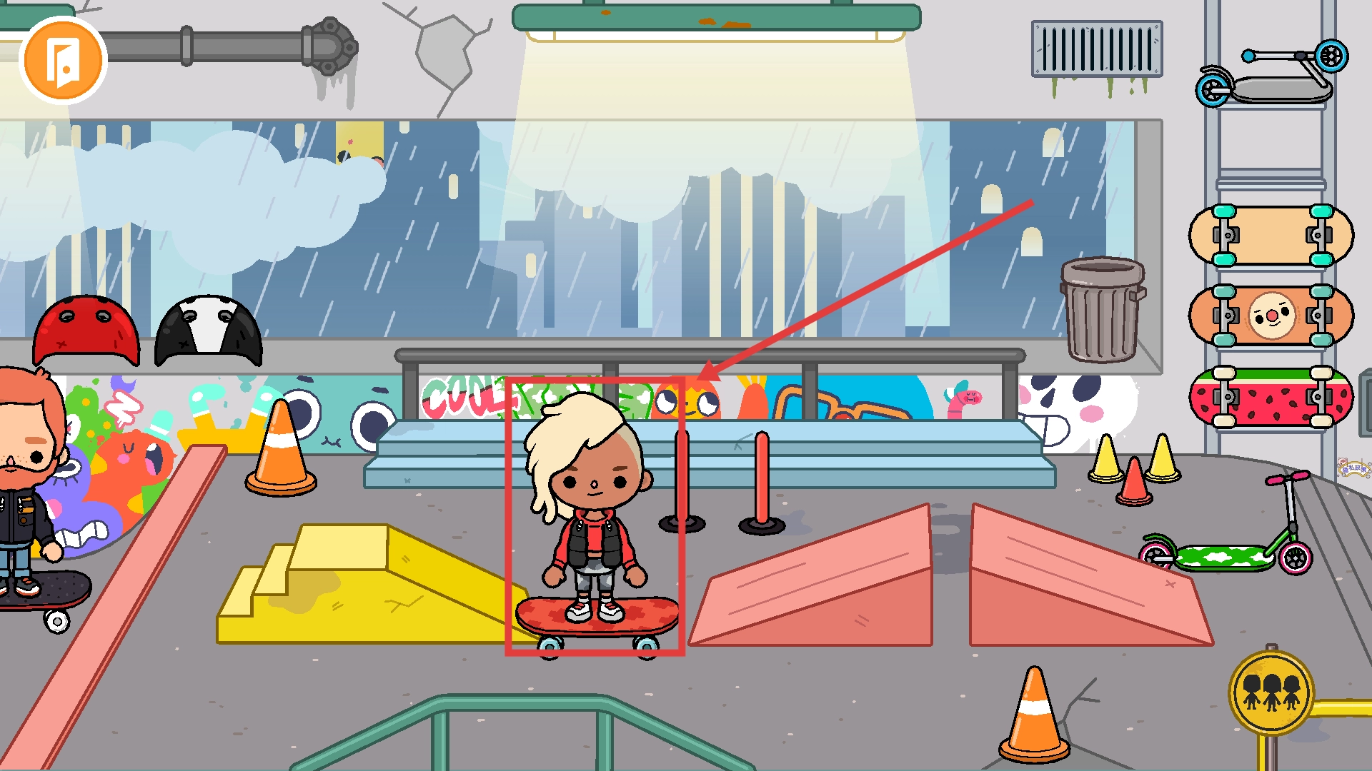 1、在建筑场景界面,点击带有标注的区域,即可进入对应的室内场景(例如滑板主题的互动空间)。
