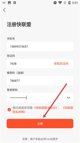 3、进入【注册快联盟】页面后,先填写号码,接着点击【获取验证码】并输入收到的验证码,然后设置登录密码,勾选协议同意选项,最后点击【注册】按钮,即可完成账号注册流程。