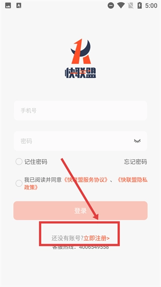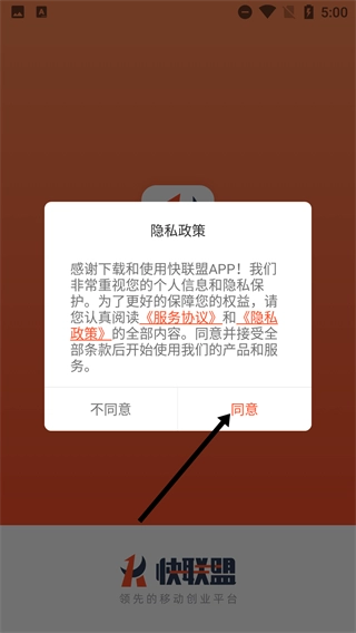 1、在【隐私政策】弹窗里,仔细阅读《服务协议》与《隐私政策》的内容后,点击【同意】按钮,即可进入快联盟的登录页面。