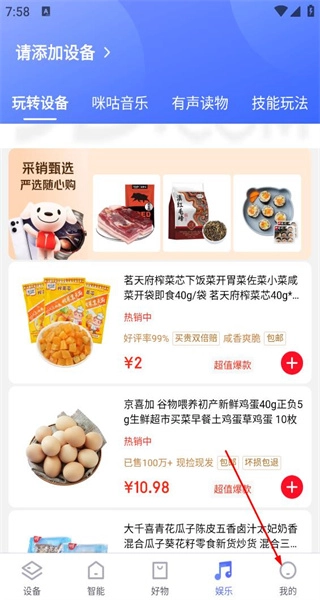 进入软件首页后,能看到设备添加、好物推荐等板块,点击底部的对应按钮,即可进入个人页面。