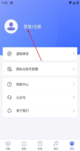 进入个人页面后,能看到登录注册入口以及虚拟体验等功能选项,点击登录注册区域即可进入登录界面。