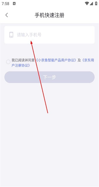 4、进入快速注册页面后,需先输入号码,勾选相关协议,再点击下一步,就能继续完成注册流程。