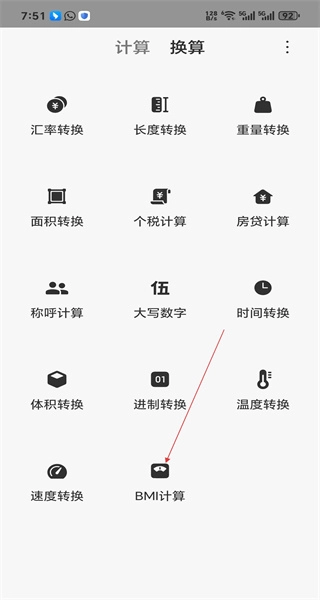 进入软件界面后,能看到汇率换算、长度转换等多种功能选项,找到BMI计算功能并点击,就能进入对应的计算页面。