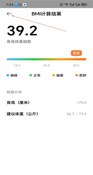 4、点击“开始计算”按钮后,系统会跳转至BMI计算结果页面,在该页面中能够查看具体的指数数值、对应的肥胖程度,以及建议体重等相关分析内容。