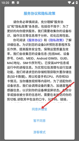 1、在【服务协议和隐私政策】弹窗里,点击【同意并接受】按钮,允许应用获取必要权限来继续使用。